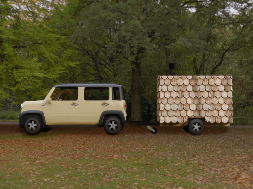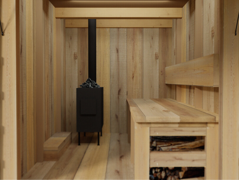 スギの足場板の廃材で作るトレーラーサウナの外装・内装3DCGパース作成を担当しました。