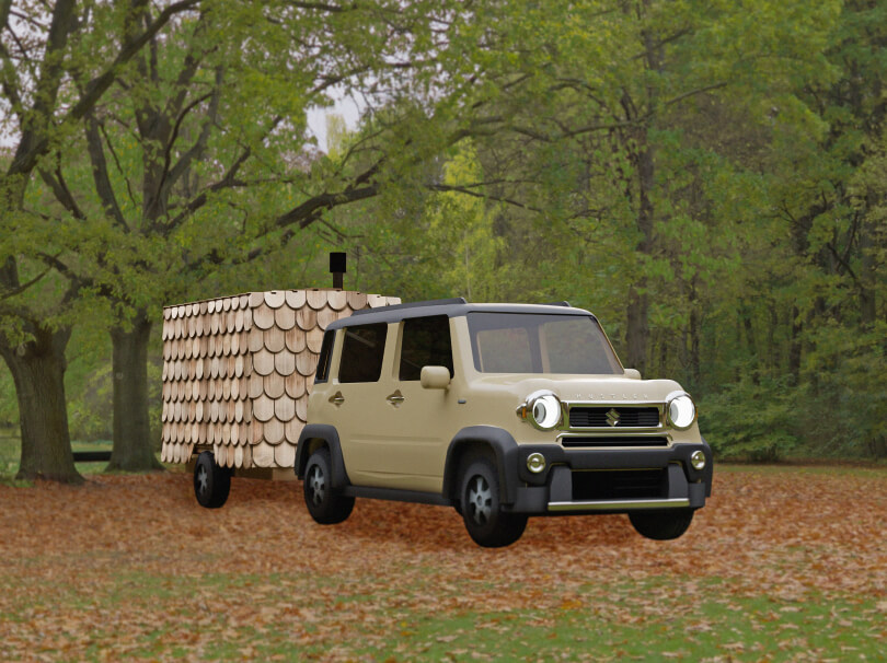 スギの足場板の廃材で作るトレーラーサウナの外装・内装3DCGパース作成を担当しました。